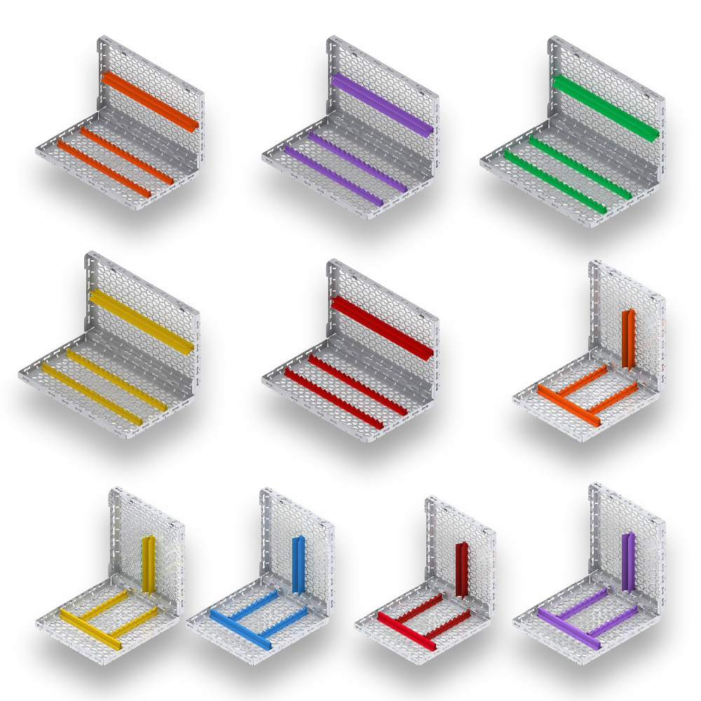 Plateau en aluminium anodisé perforé, conçu pour la stérilisation et le rangement des instruments dentaires. Sa conception favorise la circulation de la vapeur pour une stérilisation optimale en autoclave. Il possède un espace libre permettant d’ajouter des accessoires ou d’organiser les instruments selon les besoins.