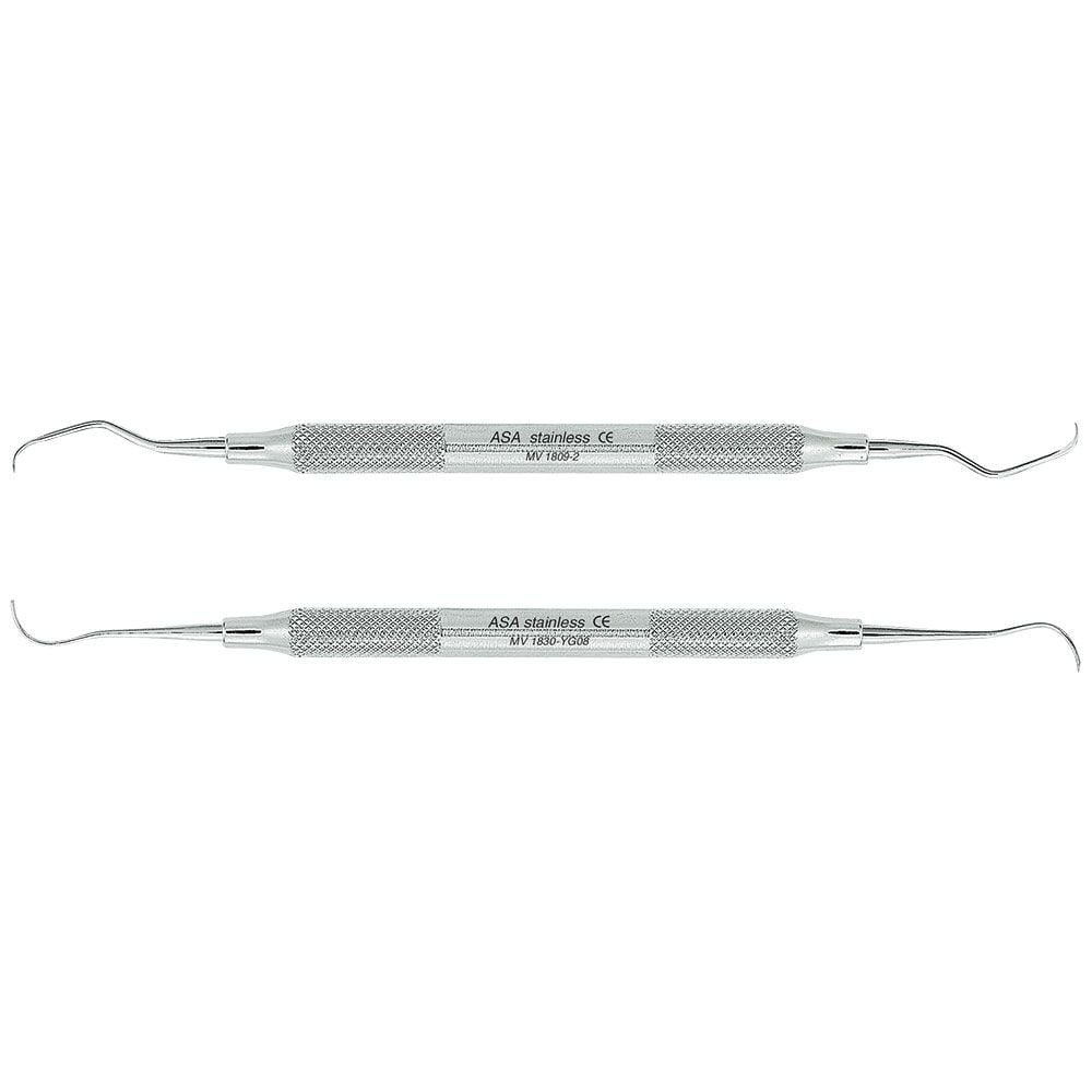 Curettes doubles à bords tranchants, pour traitements parodontaux.