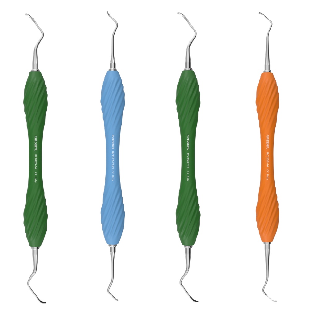 Curette parodontale double avec un manche AsaWave, conçue pour le détartrage. Les parties travaillantes en forme de faucille sont particulièrement efficaces dans les espaces interdentaires.
