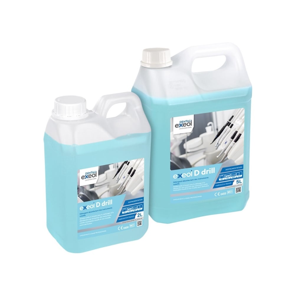 L'Exeol D Drill remplace la gamme Alkafraise d'Alkapharm. C'est une solution prête à l'emploi conçue pour le nettoyage et la désinfection par immersion des instruments rotatifs. Compatible avec l'utilisation en bac à ultrasons.