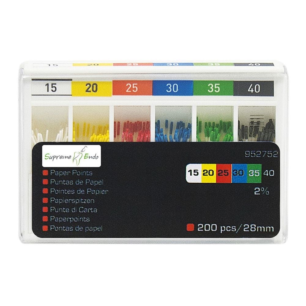 Les pointes de papier endodontiques 2%, 4% et 6% de la marque Supreme Endo sont super absorbantes et stériles, elles sèchent efficacement le canal radiculaire.