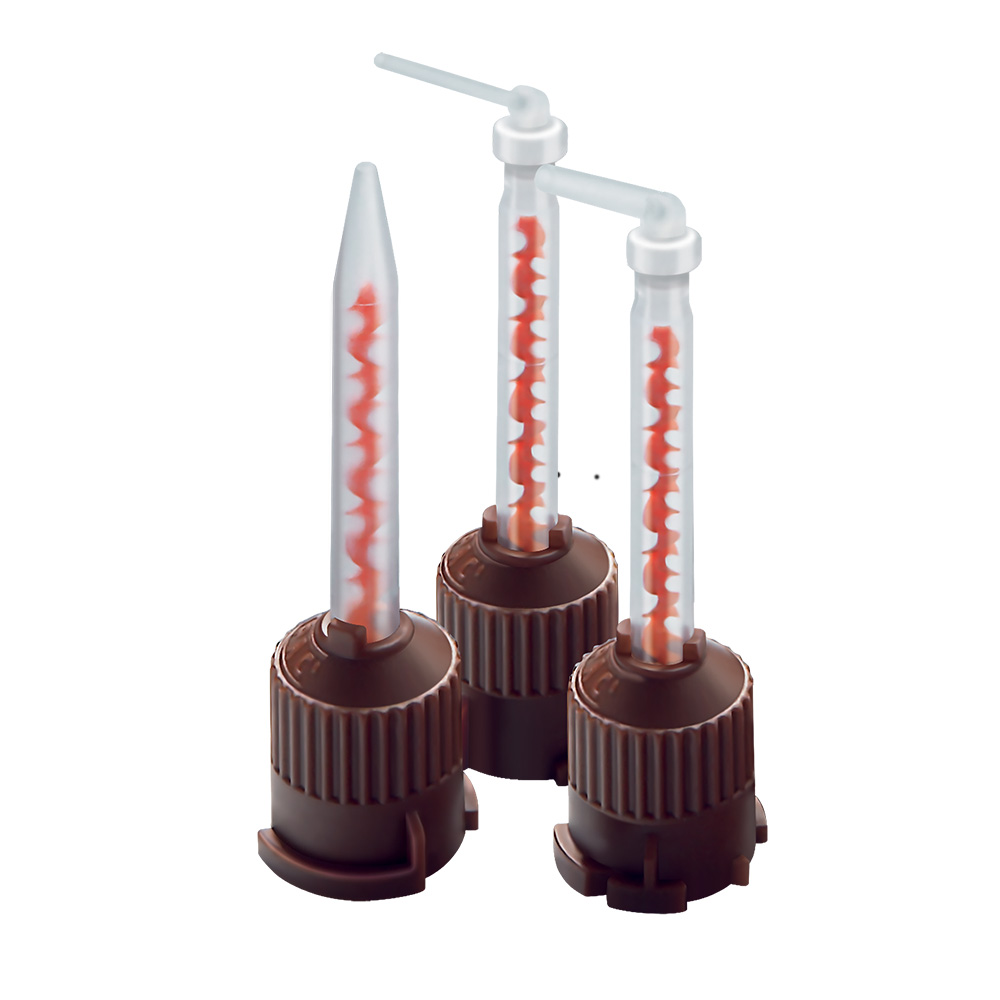 - Le kit standard contient : 5 seringues de 5 g (2 transparentes, 1 blanc, 1 blanc opaque et 1 jaune) + 30 embouts de mélange standards + 20 embouts de mélange larges+ 10 embouts intraoraux + 10 embouts intra-canalaires + 1 guide technique.