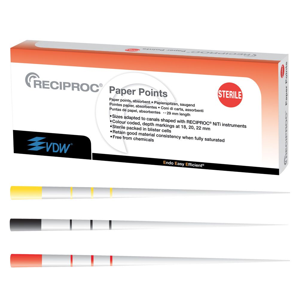 Pointes de papier stériles, à haute capacité d'absorption, conçues pour l'obturation des canaux avec le système Reciproc