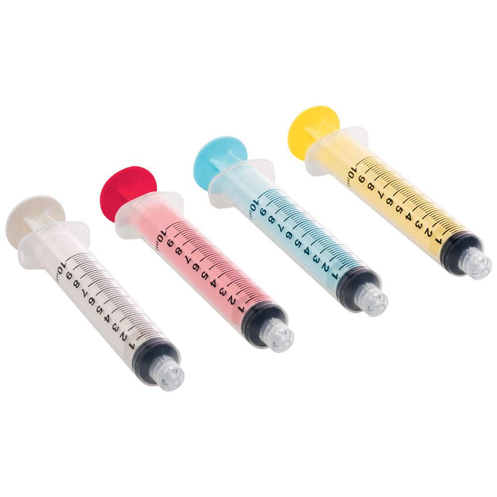 Seringues colorées (sans latex) de 10 ml permettant d'organiser et d'identifier celles destinées aux irrigants et aux solutions.